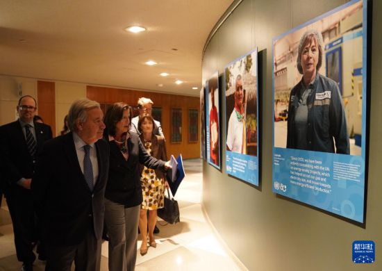 10月20日,在位于纽约的联合国总部,联合国秘书长古特雷斯(前)参观“共栖生命,共享未来”庆祝联合国成立80周年全球图片展。新华社记者张凤国摄  新华社联合国10月20日电(记者潘云召)“共栖生命