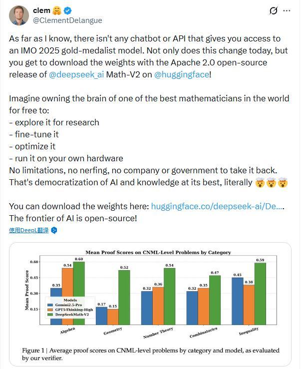 DeepSeek最新发布的开源数学模型DeepSeekMath-V2,在全球最难的高中数学竞赛中达到了金牌水平,成为首个实现这一成就的开源模型,标志着开源人工智能在复杂推理能力上的一次重大突破