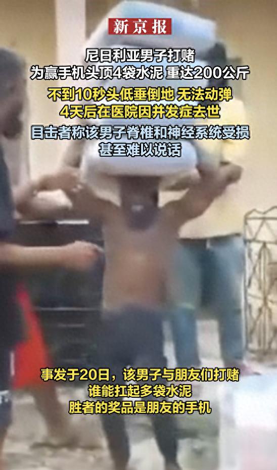 9月28日,尼日利亚一名年轻男子因打赌挑战头顶4袋水泥的画面曝光。事件发生在9月20日,这名男子与朋友打赌谁能扛起多袋水泥,胜利者将获得一部手机作为奖品。这名男子尝试用头顶起重达200公斤的水泥,这个重量几乎是男性平均体重的三倍