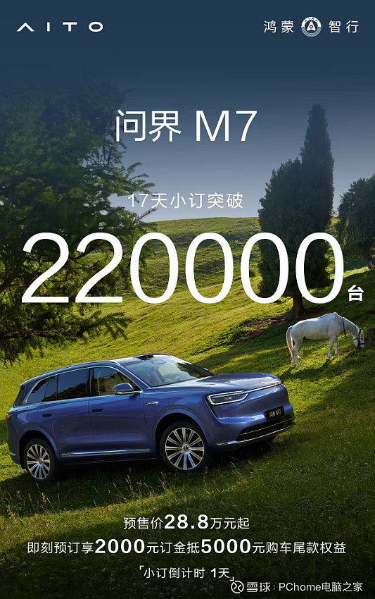 9月22日,微博博主我鸿分享称,全新问界M7在上市前已获得超过22万台小订订单,仅用时17天,显示出较强的市场热度。新车预售价为28.8万元起。问界M7提供六种车身颜色选择,包括海岛蓝、暖云白、牧野青、珊瑚红、星际蓝和鎏金黑