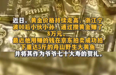 近日,浙江宁波00后小伙小孙用买黄金多年赚的8万元拍下一条珍稀的舟山野生大黄鱼,作为爷爷七十大寿加中秋的双重贺礼。据悉,野生大黄鱼价格比养殖黄鱼贵几十倍,该条重达5斤,十分稀有,在市场中和拍卖平台十分罕见。爷爷年轻时曾品尝过野生大黄鱼的鲜美...