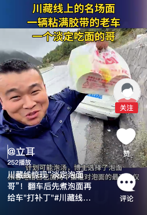 川藏线惊现“淡定泡面哥”!翻车后先煮泡面再给车“打补丁”。...